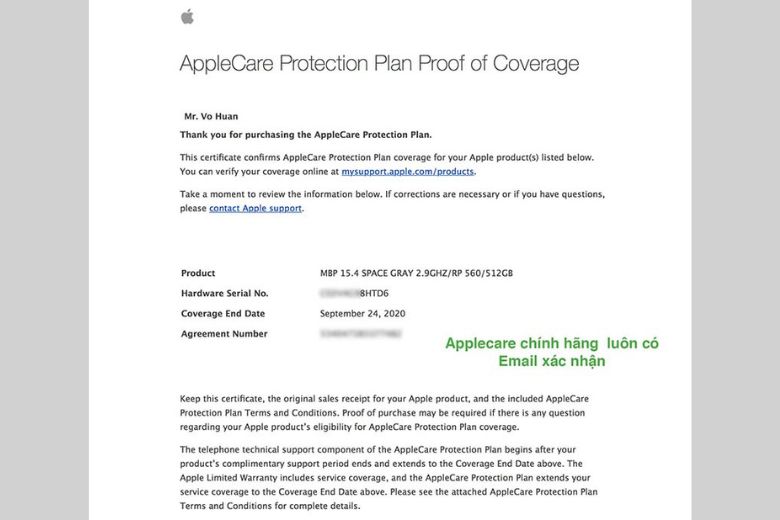 Sau khi đăng ký thành công, Apple sẽ gửi một email xác nhận đã mua gói AppleCare.