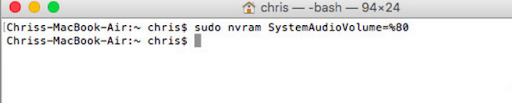 Bước 3: Trong cửa sổ Terminal, hãy nhập dòng lệnh sudo nvram SystemAudioVolume =% 80