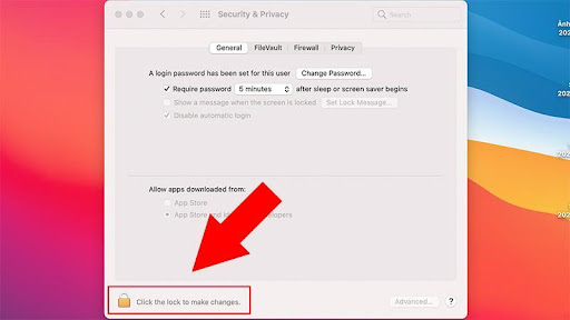 Bước 3: Tìm biểu tượng khóa góc trái bên dưới màn hình có chữ Click the clock to make changes, sau đó nhập mật khẩu để Unlock.