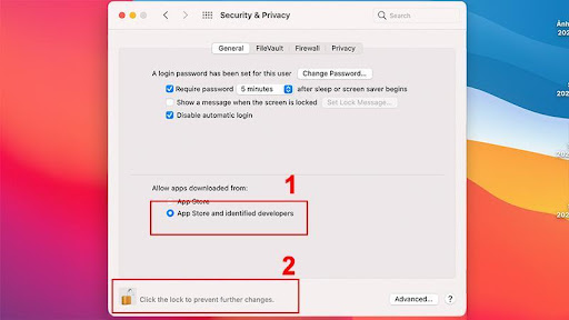 Bước 4: Khi bảng chọn hiện lên, bạn click vào mục App Store and identified developers trong mục Allow apps downloaded from. Để lưu thay đổi, hãy nhấp chọn biểu tượng ổ khóa thêm một lần nữa.