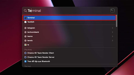 Bước 1: Bạn tìm kiếm bằng Spotlight cụm từ Terminal và chọn vào ứng dụng tương ứng.