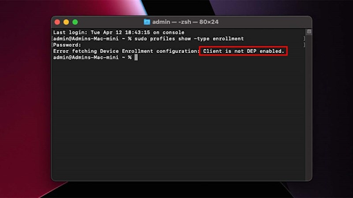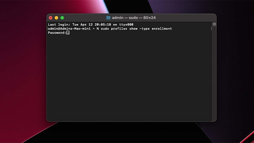 Bước 2: Tiếp theo bạn nhập đoạn mã sudo profiles show -type enrollment và nhấn Enter.Tại đây bạn nhập mật khẩu mở khóa máy, lưu ý rằng sẽ không có bất kỳ thông báo nào hiển thị bạn đang nhập mật khẩu, bạn cứ nhập xong nhấn Enter nhé.