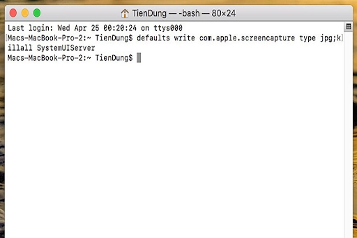 defaults write com.apple.screencapture type jpg;killall SystemUIServer