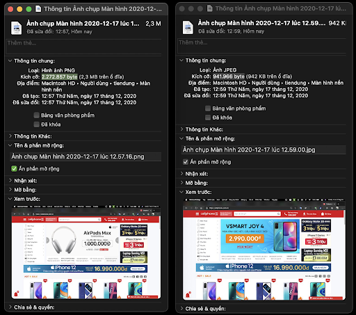 iMac nói chung và MacBook nói riêng có độ phân giải màn hình rất cao. Vì thế, ảnh chụp màn hình MacBook với định dạng PNG sẽ chiếm nhiều dung lượng bộ nhớ, khó chia sẻ. Khi chuyển sang định dạng JPEG, dung lượng ảnh chụp giảm xuống chỉ còn dưới 1MB. Dưới đây, QMac chia sẻ cho bạn hình ảnh so sánh dung lượng của hai ảnh chụp màn hình MacBook với đuôi PNG và đuôi JPEG.
