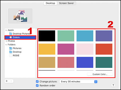 - Hình nền đơn sắc: Người dùng cũng có thể lựa chọn các hình nền đơn sắc hoặc tự tạo các hình nền đơn sắc theo ý muốn bằng cách: Nhấp đôi chuột vào mục Color > Sau đó bạn chọn màu muốn dùng làm hình nền hoặc chọn Custom Color.