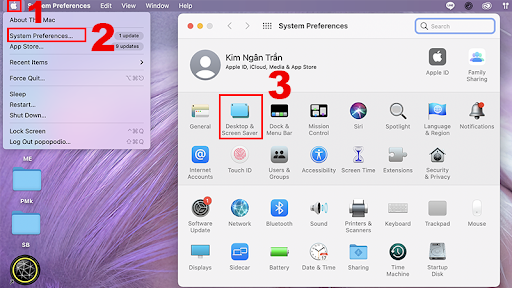 Để thay đổi màn hình mặc định, người dùng có thể thực hiện bằng cách nhấn vào logo Apple > Chọn System Preferences, sau đó chọn Desktop & Screen Saver.