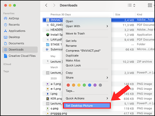 Cách 2: Download hình về MacBook > Mở Finder và tìm hình ảnh bạn muốn đặt làm hình nền > Nhấn chuột phải vào ảnh > Chọn Set Desktop Picture.