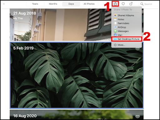Cách 3: Mở Photos > Nhấn vào hình ảnh > Bấm vào biểu tượng chia sẻ > Chọn Set Desktop Picture.