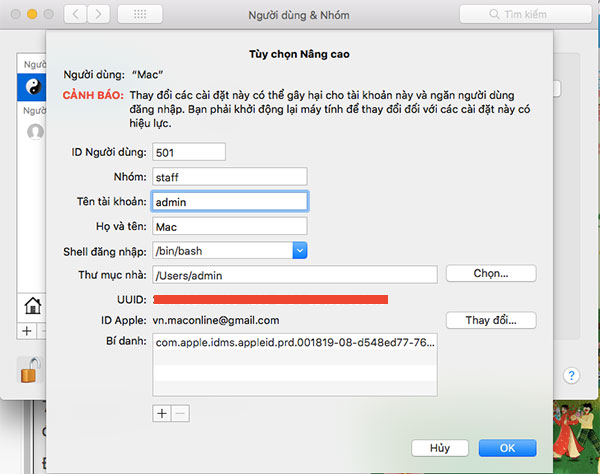 Sau khi cửa sổ Advance xuất hiện khi bạn thực hiện ở cuối bước 3, bạn tiếp tục tìm mục Account name (Tên tài khoản) và Home Directory (Thư mục nhà), bạn điền chính xác tên bạn đã tạo ở bước 2.