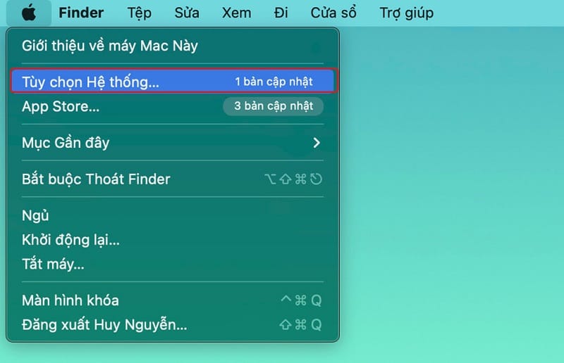 - Bước 1: Từ màn hình chính của MacBook, nhấp vào logo Apple ở góc trái trên cùng, sau đó chọn mục System Preferences (Tùy chọn Hệ thống).