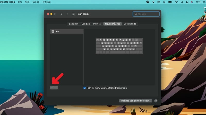 - Bước 2: Tiếp theo, vào phần Keyboard (Bàn phím), chuyển sang tab Input Sources (Nguồn đầu vào), rồi nhấn vào biểu tượng dấu “+” ở góc dưới bên phải để thêm một nguồn đầu vào mới.