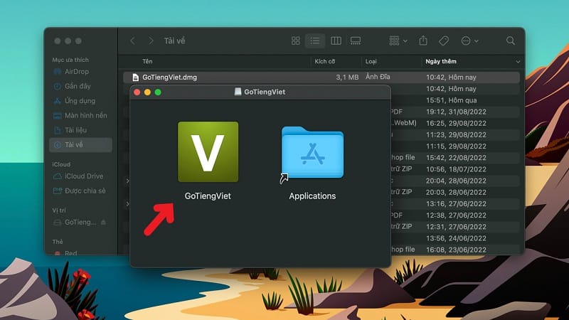 - Bước 1: Tải phần mềm từ một nguồn uy tín. Sau khi tải xong, mở file GoTiengViet.dmg và kéo biểu tượng ứng dụng vào thư mục Applications (Ứng dụng).