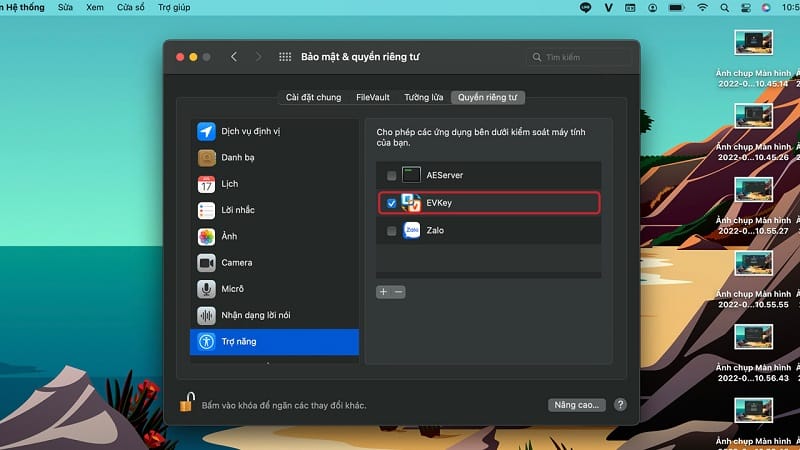 - Bước 2: Tương tự như Gõ tiếng Việt, người dùng cần cấp quyền Khả năng tiếp cận (Accessibility) cho EV Key để phần mềm hoạt động trơn trong phần Bảo mật & Riêng tư (Security & Privacy). Sau khi hoàn tất, bạn đã sẵn sàng sử dụng EV để gõ tiếng Việt với các bảng mã phổ biến như Unicode, VNI, TCVN3,... và kiểu gõ (Telex, VNI) hoàn toàn miễn phí.