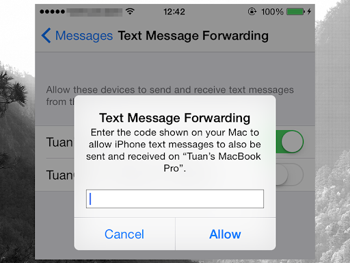 - Sau khi bật thiết bị muốn chuyển tiếp tin nhắn tới, trên iPhone của bạn sẽ xuất hiện một bảng yêu cầu nhập mã gồm 6 chữ số để xác nhận. Mã này sẽ hiện trên ứng dụng Messages trên MacBook của bạn, hãy nhập mã đó vào và nhấn Cho phép (Allow). Lúc này, quá trình thiết lập đã được hoàn thành.