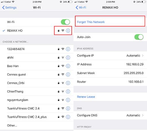 Trước tiên, hãy thử tắt kết nối Wifi và bật lại, điều này có thể giúp khắc phục các sự cố kết nối. Nếu tắt Wifi và bật lại nhưng vẫn không hoạt động, hãy thử kết nối lại với mạng bằng cách: Vào phần Cài đặt (Settings) => Tìm Wi-Fi => Nhấn chọn vào nút i => Chọn Quên mạng này (Forget This Network) => Sau đó kết nối lại mạng Wifi.