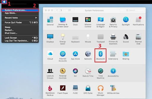 Bước 3: Chọn biểu tượng logo Apple bên góc trái màn hình, tìm đến mục System Preferences > Nhấn chọn Bluetooth.