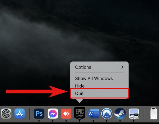 Việc bạn cần làm lúc này chính là buộc dừng các ứng dụng nặng hoặc đang gặp lỗi đó để giải phóng tài nguyên trên máy. Bạn có thể thực hiện bằng cách click chuột phải vào biểu tượng logo ứng dụng trên thanh Dock sau đó nhấn Quit.