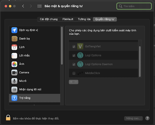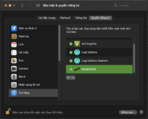 Bạn vào Tùy chọn hệ thống, nhấn chọn Bảo mật & Quyền riêng tư. Sau đó, mở tab Quyền riêng tư, chọn mục Trợ năng. Tiếp theo, bạn bấm vào Ổ khóa và nhập vân tay/mật khẩu. Cuối cùng, nhấp chọn ô Middle Click.