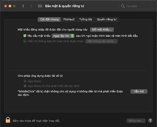 Tiếp đến, bạn vào Tùy chọn hệ thống, sau đó nhấn chọn Bảo mật & Quyền riêng tư. Tiếp theo, tại Tab cài đặt chung bạn cần cho phép mở MiddleClick.