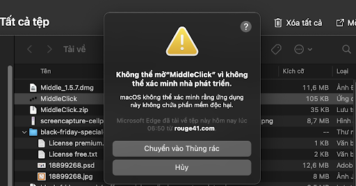 Sau khi đã giải nén hoàn tất, bạn kéo thả ứng dụng MiddlecClick vào thư mục Ứng dụng và khởi chạy ứng dụng. Sau đó, bạn sẽ nhận được một lời cảnh báo từ hệ thống khi lần đầu tiên tải ứng dụng ngoài Appstore.