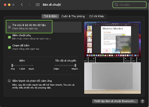 Đầu tiên, bạn nhấn vào logo hình quả táo ở góc trái màn hình, chọn Tùy chọn hệ thống. Tiếp đó, bạn chọn Bàn di chuột. Tại tab Trỏ và Bấm, bạn nhấn bỏ dấu tick ở mục Tùy chọn tra cứu và bộ dò tìm dữ liệu (Chạm bằng ba ngón tay)