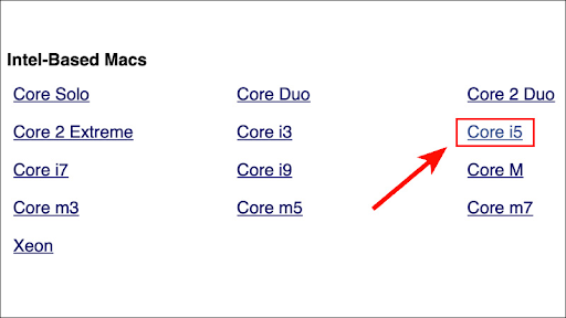 - Bước 3: Vào TẠI ĐÂY > Chọn hình phù hợp để xác nhận > Chọn loại chip Intel của máy bạn tại mục Intel-Based Macs (ví dụ là Core i5).