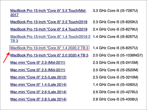 - Bước 4: Nhấn vào dòng máy có năm sản xuất và thông số bộ xử lý giống với máy Mac của bạn (ví dụ là MacBook Pro 13-Inch ”Core i5” 1.4 2020 2 TB 3).