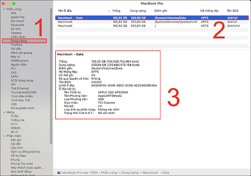 - Bước 3: Chọn Dung lượng > Chọn tên ổ đĩa (ví dụ là Macintosh – Data). Mục này sẽ mô tả chính xác về dung lượng trống và tổng dung lượng của máy, nhưng sẽ không phân loại dung lượng đã dùng như mục Ổ lưu trữ.