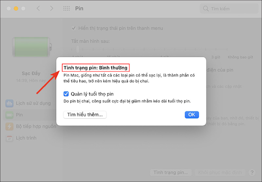 Bấm vào biểu tượng Pin trên thanh menu > Xem tình trạng pin.