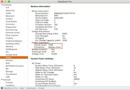 Tại đây, bạn có thể kiểm tra số lần sạc và tình trạng của pin. Nếu pin của chiếc MacBook cũ được khuyến cáo thay thế thì bạn nên thay pin cho chiếc MacBook sớm để đảm bảo an toàn khi sử dụng.