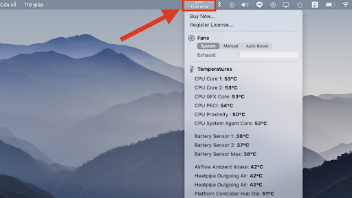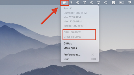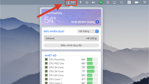 - Bước 3: Nhấn vào biểu tượng có hiển thị nhiệt độ ở trên thanh menu để xem nhanh các thông số về nhiệt độ của CPU hay pin trên thiết bị của bạn.