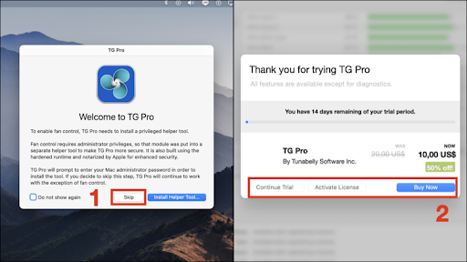 - Bước 2: Nhấn Skip > Continue Trial (Tiếp tục dùng thử), Activate License ( Trường hợp bạn đã có bản quyền ứng dụng) hoặc Buy Now ( Mua ngay) để tiếp tục sử dụng ứng dụng.