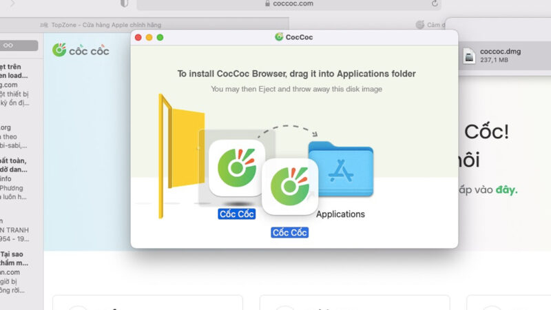 Bước 2: Sau khi tải Cốc Cốc xong, bạn kéo thả tệp vừa tải vào mục Application trên MacBook như hình bên dưới