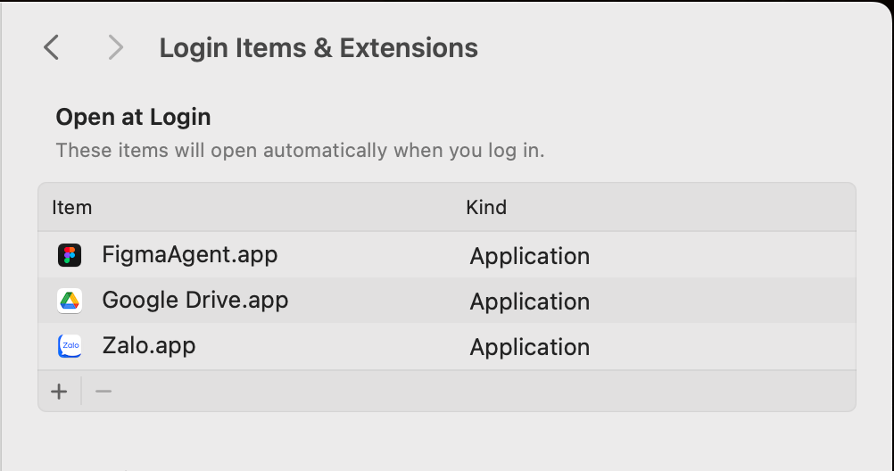 - Bước 3: Tắt, bật các ứng dụng trong Login Items bằng cách chọn vào dấu cộng hoặc dấu trừ để thêm/bớt các ứng dụng vào danh sách.
