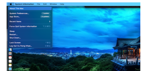 Bước 1: Nhấp chọn vào logo quả táo Apple bên góc trái màn hình, trong thanh Menu hiện ra bạn hãy tìm đến mục About This Mac.