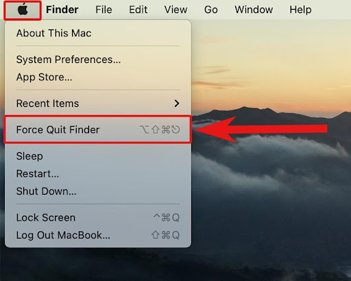 Bước 1: Chọn biểu tượng quả táo Apple ở góc trái màn hình, ở bảng Menu chọn Force Quit Finder.