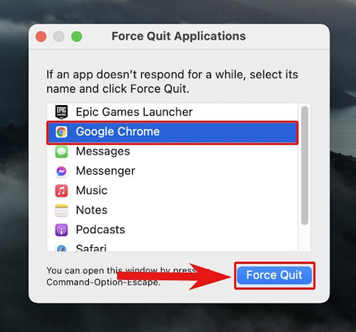 Bước 1: Nhấn tổ hợp phím Command + Option + Esc để mở Force Quit Applications
