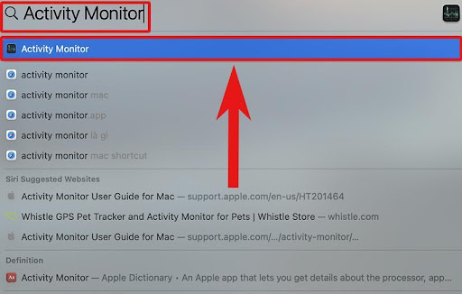 Bước 1: Để mở Activity Monitor, hãy dùng tổ hợp phím Command + Space để mở trình Spotlight. Trong thanh tìm kiếm, hãy gõ “Activity Monitor” và chọn kết quả hiển thị đầu tiên.