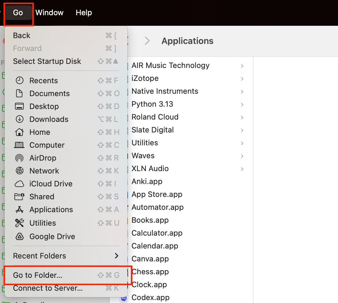 Bước 2: Chọn Go, sau đó chọn Go to Folder.