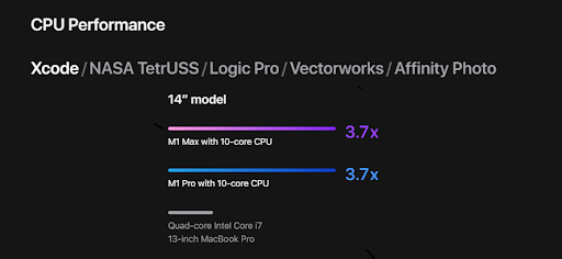 Trong buổi ra mắt sản phẩm, Apple cũng đã nhấn mạnh đây là con chip mạnh mẽ nhất ở thời điểm hiện tại, cung cấp sức mạnh gấp 8 lần so với chip M1 trước đó nhưng tiêu thụ điện năng ít hơn. Cụ thể, CPU 10 nhân trên MacBook Pro 14 “ 2021 có tốc độ nhanh gấp 3.7 lần so với CPU Intel I7 4 nhân trên người tiền nhiệm.