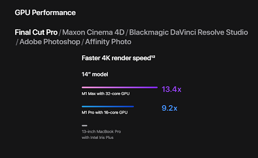 Về hiệu năng đồ họa, GPU với 16 nhân trên MacBook 14 inch 2021 xử lý các tác vụ đồ họa nhanh gấp 9.2 lần so với chip đồ họa tích hợp Intel Iris Plus trên MacBook Pro 13” tiền nhiệm.