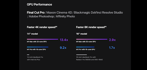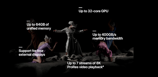 Cả chip M1 Pro và M1 Max đều được trang bị hỗ trợ gia tốc phần cứng cho các định dạng H.264, HEVC, ProRes và ProRes RAW. Riêng M1 Max còn nhân đôi mã hóa ProRes, giải mã động cơ và nhân đôi động cơ mã hóa video.
