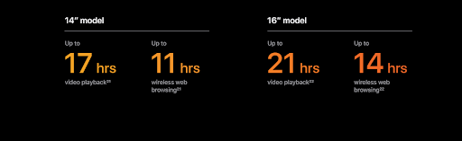 Thời lượng pin trên MacBook Pro 14” và 16” là cực khủng. Theo công bố của Apple, MacBook Pro 14” có thời lượng lướt web lên đến 11 tiếng liên tục trong khi đó bản 16” có thời gian hoạt động liên tục lên đến 14 giờ. Đi kèm đó là tính năng sạc nhanh giúp chiếc MacBook có thể sạc 50% pin trong vòng 30 phút.