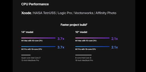 Theo Apple, con chip M1 Pro cung cấp hiệu năng mạnh mẽ hơn 70% so với con chip M1 và có hiệu suất đồ họa nhanh hơn gấp đôi so với M1. Song song đó, chip M1 Max cũng được trang bị CPU 10 nhân và GPU lên đến 32 nhân giúp hiệu suất đồ họa nhanh gấp 4 lần so với chip M1. Như vậy, sự khác biệt giữa 2 con chip này là khả năng xử lý đồ họa khi chip M1 Max được trang bị 32 nhân GPU đồ họa để xử lý các tác vụ đồ họa mạnh mẽ hơn.