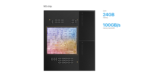 Bên cạnh đó, MacBook Air M2 còn được trang bị RAM lên đến 24GB và bộ nhớ có tốc độ truyền tải lên đến 100GB/s.