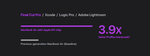 Nếu bạn đang tìm kiếm một chiếc laptop có thiết kế đẹp, nhỏ gọn và hiệu năng mạnh mẽ trong tầm giá dưới 30 triệu thì MacBook Air M1 là sản phẩm mà chắc chắn bạn không thể bỏ qua. Từ những thông tin mà Apple cung cấp, MacBook Air M1 có hiệu nặng mạnh mẽ vượt trội so với các dòng MacBook chạy chip Intel trước đó. Cụ thể, MacBook Air M1 với con chip M1 Silicon sở hữu 8 core CPU và 7 core GPU tích hợp mạnh mẽ (phiên bản cấu hình thấp nhất). Theo dữ liệu từ trang chủ chính thức của Apple, CPU của MacBook Air M1 có thông số xử lý các tác vụ nhanh gấp 3.9 lần so với MacBook Air chạy chip Intel.