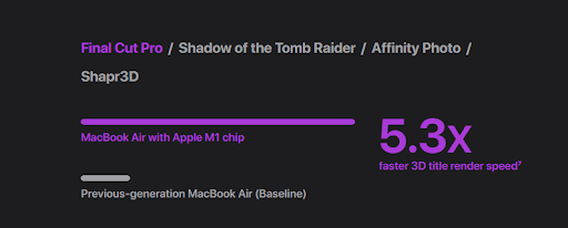 Bên cạnh đó, đối với thông số GPU thì MacBook Air M1 cũng cho một hiệu năng đáng kinh ngạc với tốc độ xử lý các tác vụ đồ họa năng nhanh gấp 5,3 lần so với MacBook Air Intel 2020.