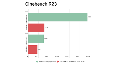 Với phần mềm Cinebench R23, MacBook Air M1 cho ra một kết quả vô cùng ấn tượng. Với 8 nhân CPU, MacBook Air M1 có kết quả điểm đa nhân đạt 5725 điểm và đơn nhân đến 1548 điểm; con số thực sự khủng khiếp và tương đương với những chiếc máy 8 nhân 16 luồng. Trong khi đó, MacBook Air Intel chỉ có 2 nhân 4 luồng cho ra kết quả thấp với 1487 điểm và đơn nhân 880 điểm.