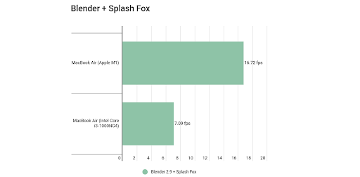 Với bài so sánh GPU, QMac đã tiến hành Render một file thiết kế 3D hoạt hóa Splash Fox. Kết quả MacBook Air M1 có thể Render các hiệu ứng Animation một cách mượt mà, tỉ lệ khung hình luôn ổn định và không bị giật lag. Tỉ lệ khung hình đo được trên Apple M1 là 16,72 fps so với 7,09 fps trên MacBook Air Intel.