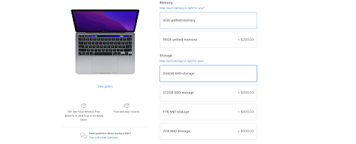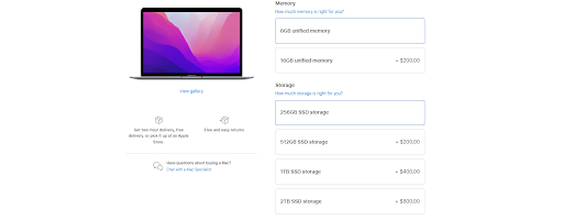 Nói cách khác, trên cùng một tầm giá bạn sẽ mua một chiếc MacBook Pro M1 có cấu hình cơ bản hay giá của MacBook Air 2021 có dung lượng RAM và bộ nhớ gấp đôi. Apple cũng có phép bạn các option nâng cấp với giá: